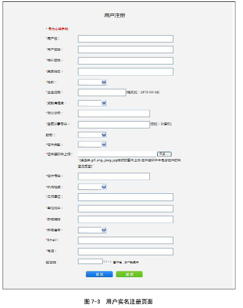 用户注册页面如图7-3 所示。用户注册时必须填写的信息项包括用户名、密码、真实姓名、出生日期、证件号码、工作单位、单位地址、邮政编码、毕业学校、当前从事专业、邮箱、电话、验证码,选择填写性别、受教育程度、职称、证件类型、机构性质、所在省市,并将证件复印件上传。用户注册信息的填写必须真实、准确、完整和规范。系统收到注册信息后将由省科技报告管理服务中心工作人员进行核实,审核通过后将给用户发送邮件返回注册信息表单。用户使用审核通过的账号,方可登录系统。