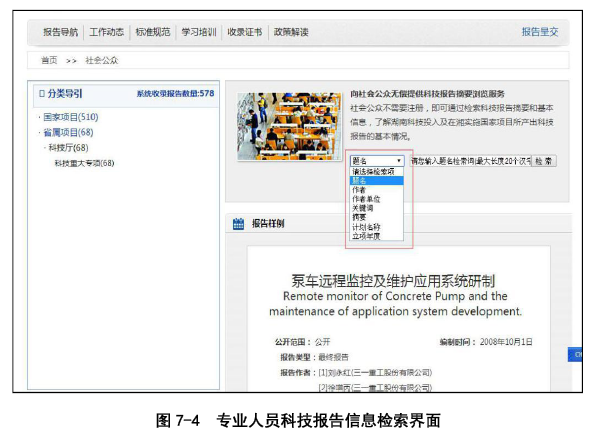 专业人员科技报告信息检索页面如图7-4 所示,用户可选择某一个查询条件,如题名、作者、作者单位、关键词、摘要、计划名称、立项年度等,输入检索词,点击检索,系统将模糊匹配检索,并显示检索结果。