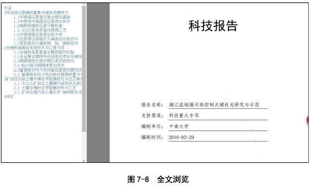 点击检索结果进入报告详细信息页,可以浏览报告摘要等详细信息,如图7-7所示。注册用户登录后可以点击“在线全文浏览”阅读科技报告全文,如图7-8所示。如果用户未登录,系统跳转登录页面。