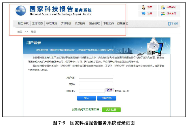 需要提示的是,如果用户选择的是国家项目中的科技报告,点击“在线浏览”时,系统会跳转到国家科技报告系统登录界面(如图7-9),此时需要输入用户名、密码再次登录,进入系统后,重新执行检索并点击“在线浏览”,即可浏览报告全文。