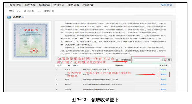 经确认为科技报告第一作者的项目申报人可以领取收录证书。领取人需在系统实名注册和登录,进入“收录证书”栏目,检索浏览需要领取收录证书的科技报告,点击“请领取”按钮,如图7-13 所示。